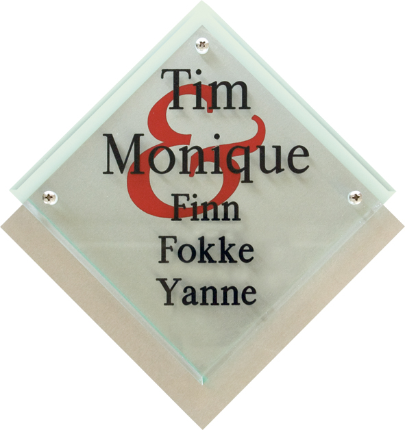 Glaslook is geen glas (glas is uiteraard erg breekbaar), maar een luxe en tegelijk stevige kunststofsoort (8 mm dikte) met de uitstraling van glas. Het materiaal is dan ook volledig doorzichtig en verkrijgbaar in verschillende kleurvarianten. Glaslook is uitstekend geschikt voor gebruik in en rondom uw woning. De tekst wordt in alle glaslook-naamborden gegraveerd, waardoor uw naam niet weg kan slijten of vervagen. Het bijzondere aan glaslook is dat het aan de achterzijde ingegraveerd wordt, dit in tegenstelling tot andere kunststofsoorten. Hierdoor blijft het materiaal aan de voorzijde glad en krijgt het een zeer luxe uitstraling. Tot slot: Glaslook wordt geleverd met afstandbusjes waardoor u het naambord eenvoudig op een korte afstand van de muur kunt monteren. Glaslook een zeer exclusieve kunststofsoort dat tegen een stootje kan!