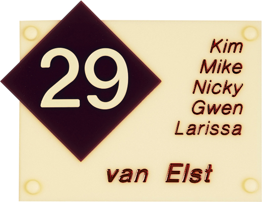 Perspex is een stevige kunststofsoort (3 mm dikte), welke uitstekend geschikt is voor gebruik in en rondom uw woning. De tekst wordt in alle perspex-naamborden gegraveerd, waardoor uw naam niet weg kan slijten of vervagen. De transparante perspex naamborden worden aan de achterzijde ingegraveerd (waardoor de voorkant glad blijft) en de gekleurde perspex naamborden worden aan de voorzijde ingegraveerd. Tot slot: de perspex-naamborden zijn standaard voorzien van schroefgaten (tenzij anders vermeld) en worden geleverd met afstandbusjes en afdekdopjes waardoor u het naambord eenvoudig op een korte afstand van de muur kunt monteren.
